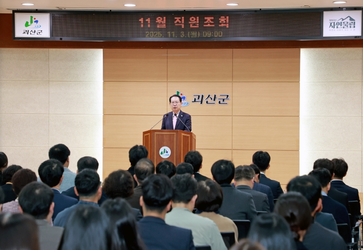 [무한뉴스=정민정 기자] 충북 괴산군은 3일 군청 대회의실에서 11월 직원조회를 열고, 올해 지역축제의 성과와 연말까지 중점 추진할 과제들을 공유했다.