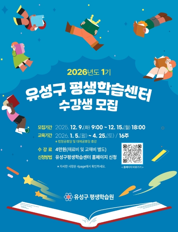 [무한뉴스=정민정 기자] 대전 유성구는 오는 9일부터 15일까지 구암평생학습센터와 전민평생학습센터에서 운영하는 ‘2026년도 1기 평생학습센터’ 수강생을 모집한다.