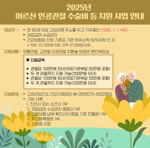 지원 대상은 고성군에 주소를 둔 만 60세 이상 의료급여 수급자, 차상위 계층, 건강보험료 산정 기준 하위 50% 이하(직장가입자 월 127,500원 이하, 지역가입자 월 57,000원 이하) 어르신이다.