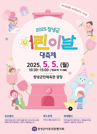 [무한뉴스=최진수 기자] 창녕군아동위원협의회는 오는 5월 5일 제103회 어린이날을 맞아 ‘2025 창녕군 어린이날 대축제’를 창녕군민체육관 광장에서 개최한다고 밝혔다.