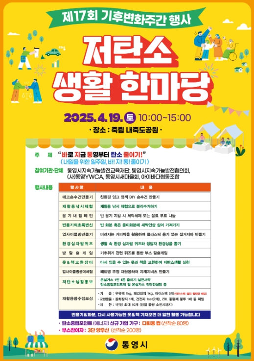[무한뉴스=최진수 기자] 통영시는 지구의 날(4월22일)을 맞이해 오는 19일(토) 광도면 내죽도공원에서 ‘저탄소 생활 한마당’행사를 개최한다.