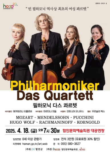 [무한뉴스=최진수 기자] 세계 최고의 오케스트라 중 하나로 꼽히는 빈 필하모닉에서 탄생한 최초의 여성 현악 사중주단 필하모닉 다스 콰르텟(Philharmoniker Das Quartett)이 오는 18일 저녁 7시 30분 함안문화예술회관 대공연장에서 함안 관객을 찾는다.
