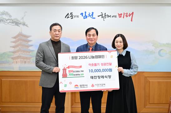 [무한뉴스=최진수 기자] 김천시는 지난 1일, 태찬장례식장이 이웃돕기 성금 1,000만 원을 전달하며 희망2026나눔캠페인‘김천 1호’ 기부자가 됐다고 밝혔다.
