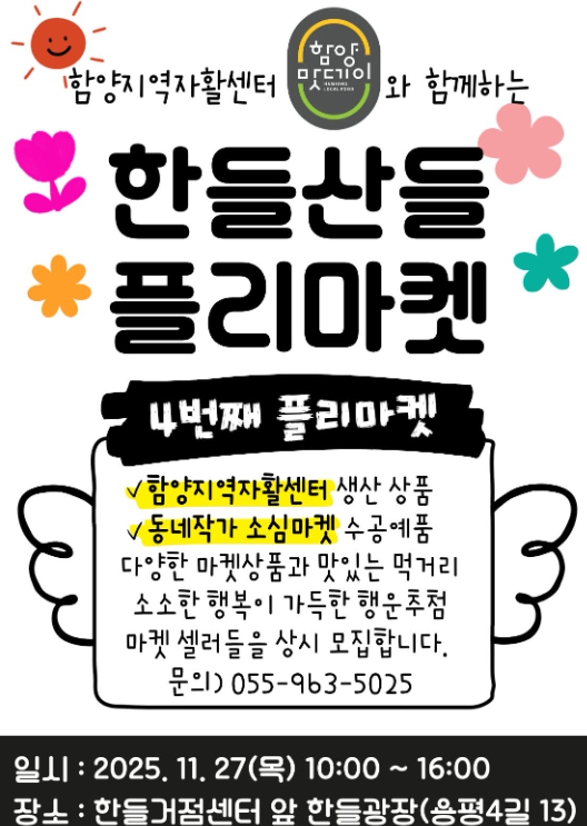 이번 플리마켓에는 함양지역자활센터 생산품, 동네 작가·소상공인의 수공예품, 로컬푸드 및 농산물, 먹거리 부스, 주민 참여형 행운추첨 이벤트 등이 구성되어 지역 주민 누구나 즐길 수 있는 참여형 축제로 꾸며진다.