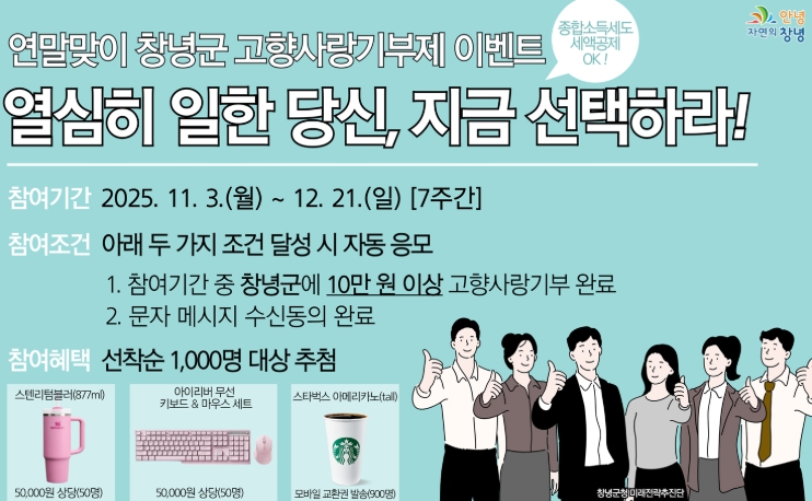 [무한뉴스=최진수 기자] 창녕군이 11월 3일부터 12월 21일까지 약 7주간 직장인을 중심으로 연말 맞이 고향사랑기부제 이벤트를 진행한다고 밝혔다.