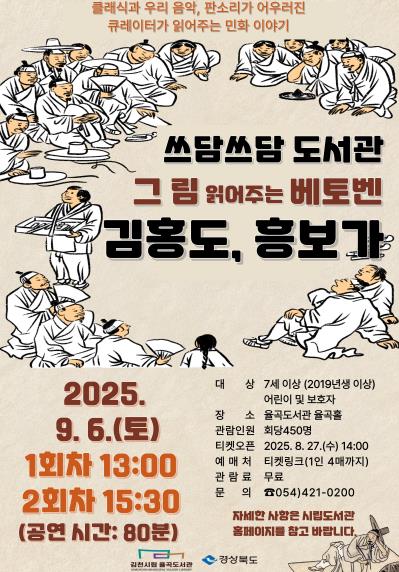 [무한뉴스=최진수 기자] 김천시립 율곡도서관은 오는 9월 6일 토요일에 율곡도서관 율곡홀에서 명화와 클래식 음악이 어우러진 복합 예술 콘서트 '그림 읽어주는 베토벤 - 김홍도, 흥보가'를 개최한다고 밝혔다.