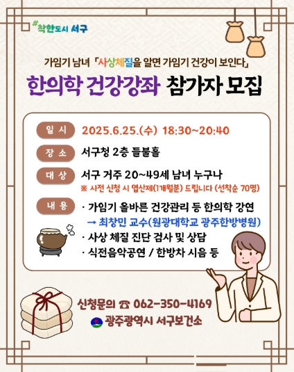 [무한뉴스=정민정 기자] 광주광역시 서구는 오는 25일 서구청 들불홀에서 청·장년층을 대상으로 한의학 건강 강좌 ‘사상체질을 알면 가임기 건강이 보인다’를 진행한다.