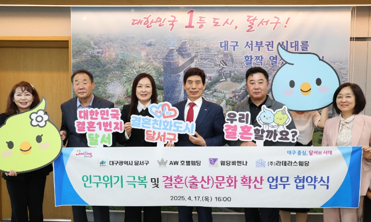 [무한뉴스=최진수 기자] 대구 달서구가 달서구청에서 AW 호텔웨딩, 웨딩비엔나, ㈜라테라스웨딩과 함께 초저출생 인구 위기 극복과 긍정적 결혼·출산 문화 확산을 위한 업무협약을 체결했다.