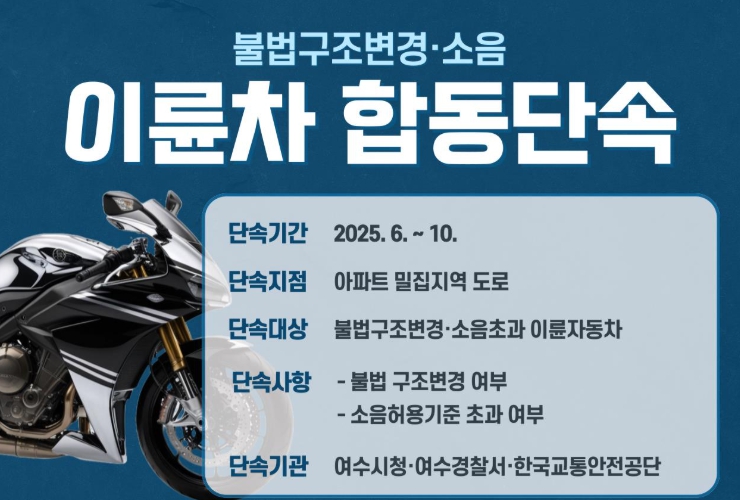 여수시 관계자는 “위반 사항이 적발되면 예외 없이 법적 조치를 취할 예정”이라며 “배달 대행업체 등 이륜차 운전자들은 저소음 운행과 법규 준수에 적극 동참해 주길 바란다”고 말했다.