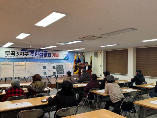 [무한뉴스=최진수 기자] 김천시는 2026년 지적재조사사업 실시계획에 따른 사업지구 지정을 위하여 1월 13일 평화동 보훈회관에서 부곡3지구 토지소유자 및 이해관계인 등을 대상으로 주민설명회를 개최했다.
