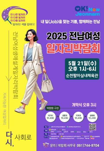 [무한뉴스=정민정 기자] 순천시는 오는 21일 오후 1시부터 6시까지, 순천팔마실내체육관에서 취업을 희망하는 여성들에게 일자리 정보를 제공하고 취ž창업을 연계하는 '2025년 전남여성생애일자리박람회'를 개최다고 밝혔다.