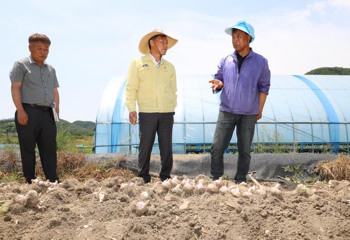 [무한뉴스=정민정 기자] 전춘성 진안군수는 본격적인 마늘 수확철을 맞아 수확이 한창인 성수면 마늘 재배현장을 찾아 농가의 애로사항을 듣고, 실질적인 지원 방안을 모색했다.