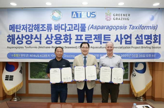 [무한뉴스=정민정 기자] 완도군은 지난 6월 5일 해양 블루테크 스타트업 AT4US Korea와 글로벌 바다고리풀 연구 기업 Greener Grazing LLC와 토종 바다고리풀(Asparagopsis taxiformis)을 활용한 양식 산업 발전과 축산 메탄 저감 탄소 중립 실현을 위한 3자 간 업무 협약을 체결했다.
