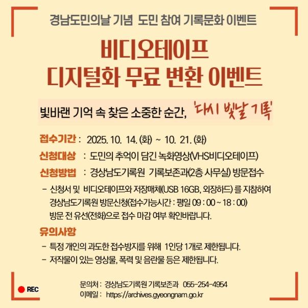 [무한뉴스=최진수 기자] 경상남도기록원은 10월 14일부터 31일까지 도민이 소중한 추억을 오래도록 보존할 수 있도록 '빛바랜 기록 속 찾은 소중한 순간 – 다시 빛날 기록'이라는 주제로 비디오테이프 디지털 변환 이벤트를 추진한다고 밝혔다.