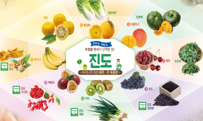 특히, 농림축산식품부에서 인증하는 지리적표시 4대 우수 농산물인 진도검정쌀, 진도대파, 진도구기자, 진도울금과 조도쑥, 월동배추, 유자, 단호박 등 총 15개 품목을 담았다.