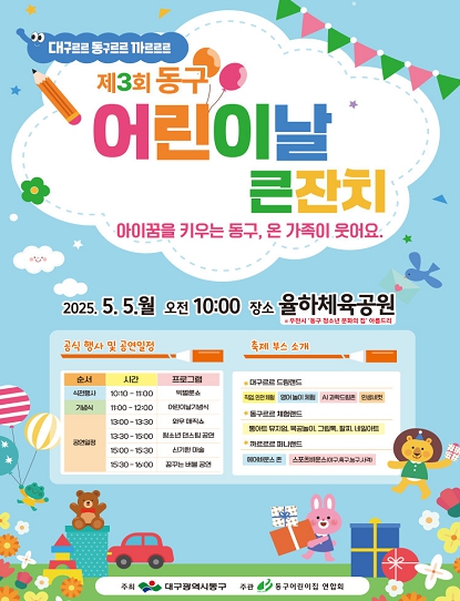 [무한뉴스=최진수 기자] 대구 동구청은 5월 5일 어린이 날을 맞아 율하체육공원에서 ‘제3회 동구 어린이날 큰잔치’를 개최한다.
