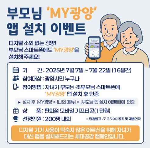 [무한뉴스=정민정 기자] 광양시는 모바일 통합행정 플랫폼 ‘MY광양’의 실사용률을 높이고 전 세대가 함께 활용하는 플랫폼으로 정착시키기 위해, 7월 7일부터 22일까지 16일간 ‘부모님 MY광양 앱 설치 이벤트’를 운영한다고 밝혔다.