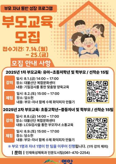 [무한뉴스=정민정 기자] 영암군은 여름방학을 맞아 부모와 자녀가 함께하는 ‘2025년 부모교육’ 참가자를 이달 25일까지 선착순 모집한다.