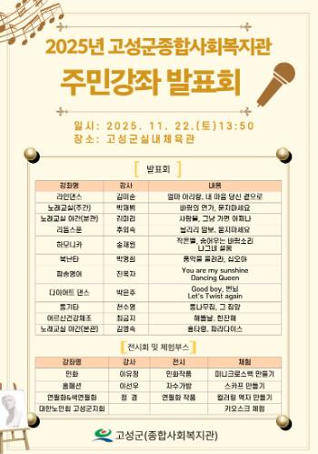 [무한뉴스=최진수 기자] 고성군에서 운영 중인 고성군종합사회복지관에서는 11월 22일14시부터 고성군실내체육관에서 수강생 및 지역주민을 대상으로 2025년 주민강좌 발표회 및 전시회를 개최한다.