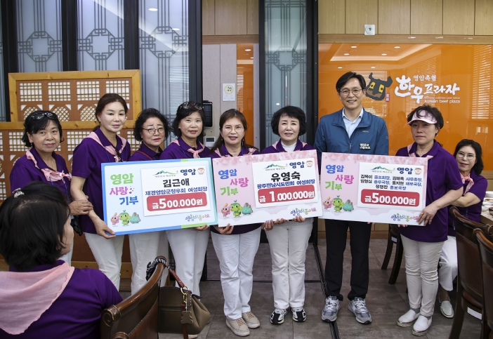 영암읍 축협한우플라자에서 열린 고향사랑기부금 전달식에서 유영숙 회장, 김근애 영암군여성회장을 포함한 여성회 임원들은 십시일반한 성금을 영암군에 전했다.