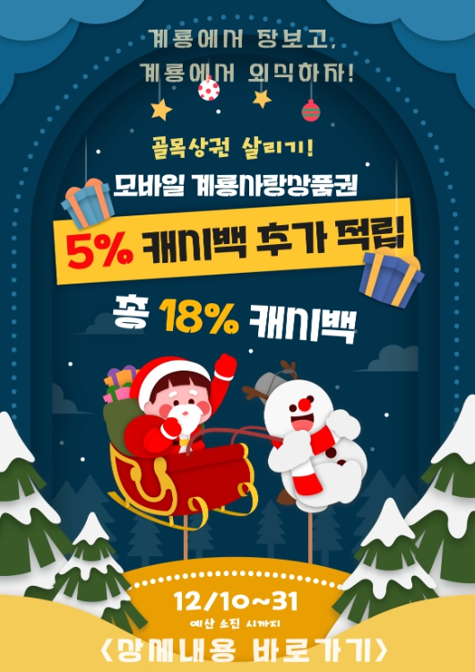 [무한뉴스=정민정 기자] 계룡시는 연말을 맞아 지역 소비 촉진과 골목상권 활성화를 위해 10일부터 31일까지(예산 소진 시 조기 종료) 골목상권 가맹점에서 모바일 계룡사랑상품권으로 결제하면 기존 13% 캐시백에 5%를 추가하여 최대 18% 적립 혜택을 제공한다고 밝혔다.