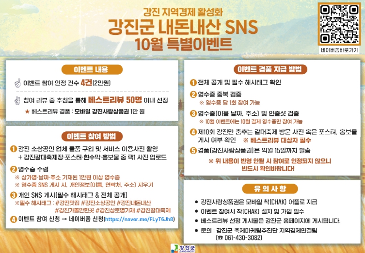 [무한뉴스=정민정 기자] 강진군이 제10회 강진만춤추는 갈대축제를 기념해 관내 소상공인 업소 활성화와 홍보 지원을 위해 추진 중인 ‘강진군 내돈내산 SNS 리뷰 이벤트’를 10월 한 달간 특별하게 진행한다.