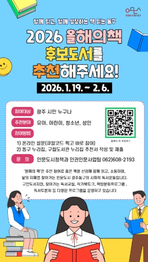 [무한뉴스=정민정 기자] 광주 동구는 한 해 동안 시민과 함께 읽을 2026년 ‘책 읽는 동구 올해의 책’ 선정을 위해 후보 도서 추천을 오는 2월 6일까지 접수한다고 밝혔다.