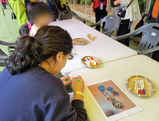 | ▲ 지난해 진행한 유아숲 페스티벌에서 아이와 부모가 함께 나무에 그림을 그리고 있다. |