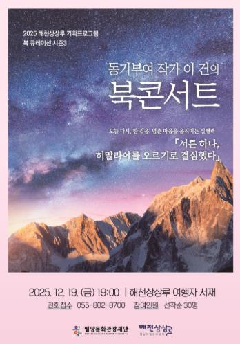 [무한뉴스=최진수 기자] 밀양문화관광재단은 오는 19일 오후 7시 해천상상루 여행자 서재에서 밀양여행문화센터 기획프로그램 ‘2025 북 큐레이션’ 네 번째 북 콘서트를 개최한다.