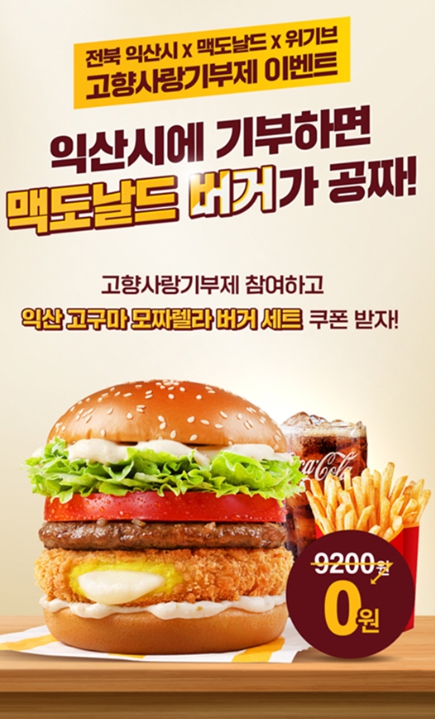 익산시는 한국맥도날드의 '익산 고구마 모짜렐라 버거' 출시를 기념해, 고향사랑기부제 참여자를 대상으로 한 이벤트를 진행한다고 10일 밝혔다.