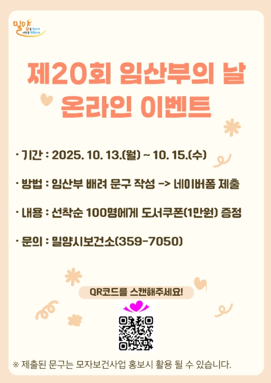 [무한뉴스=최진수 기자] 경남 밀양시는 제20회 임산부의 날을 맞아 13일부터 15일까지 3일간 온라인 이벤트를 진행한다고 밝혔다.