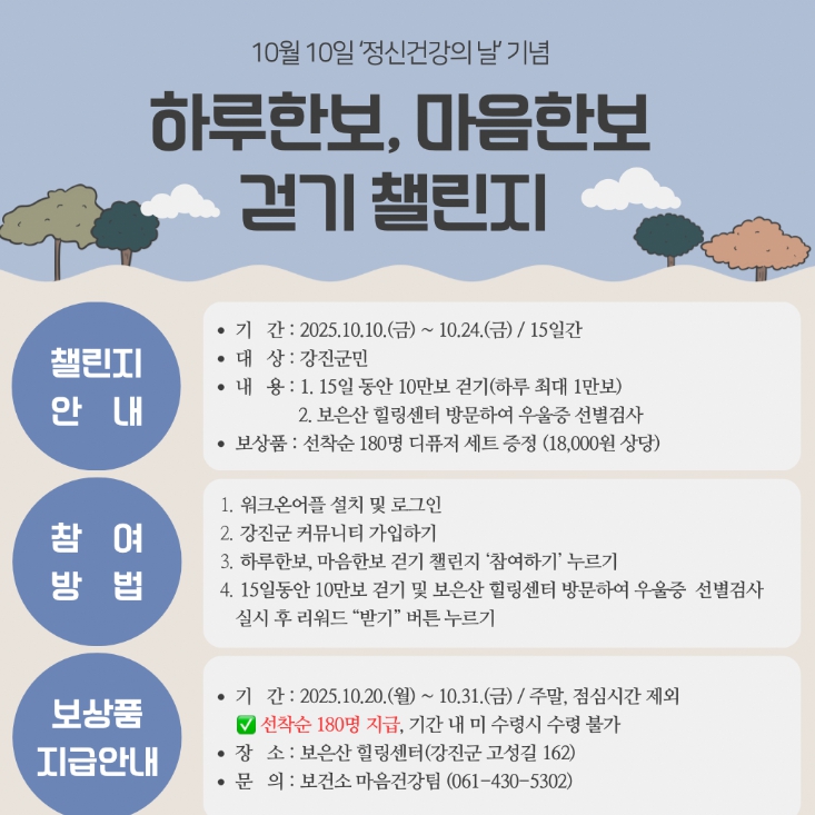 챌린지는 강진 군민 누구나 참여할 수 있으며, 15일간 10만보 걷기(하루 최대 1만보) 및 보은산 힐링센터(강진읍 고성길 162)에 방문해 우울증 선별검사를 실시하면 된다.