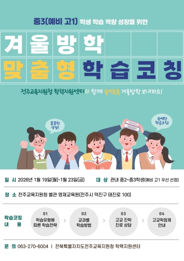 [무한뉴스=정민정 기자] 전북특별자치도전주교육지원청은 학교급 전환기를 맞은 중학교 3학년 학생들의 학습 공백을 최소화하고, 성공적인 고등학교 안착을 돕기 위해 ‘겨울방학 맞춤형 학습코칭’을 운영한다고 15일 밝혔다.