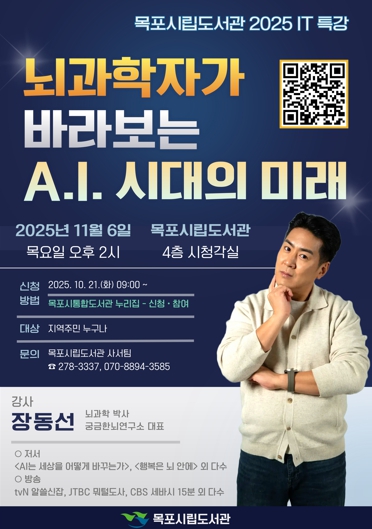 [무한뉴스=정민정 기자] 목포시립도서관은 오는 11월 6일 오후 2시, 급속히 확산되는 인공지능 시대에 발맞춰 지역 주민을 위한 특별 강연을 개최한다.