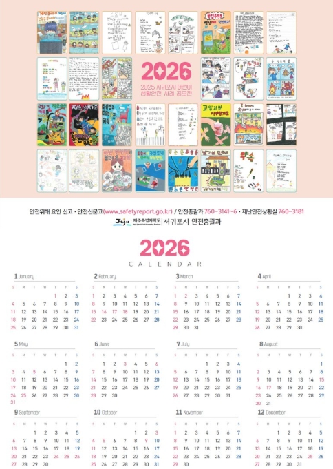 [무한뉴스=정민정 기자] 서귀포시는 지역사회에 생활 속 안전의식 확산을 위해 2025 어린이 생활안전사례 공모전 수상작 30작품을 활용한 안전문화달력 1,500부를 제작하여 전 부서와 학교, 유관기관에 배부했다고 밝혔다.