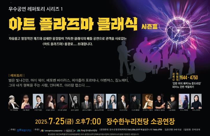 [무한뉴스=정민정 기자] 장수군은 오는 25일 오후 7시 장수한누리전당 소공연장에서 ‘아트 플라즈마 클래식 시즌3’ 공연을 개최한다고 밝혔다.