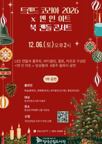 [무한뉴스=정민정 기자] 정선군립도서관은 오는 12월 6일 오후 2시, 정선군 가족센터 2층 대강당에서 ‘트렌드 코리아 2026 × 엔 인 아트 북 캔들 콘서트’를 개최한다고 2일 밝혔다.