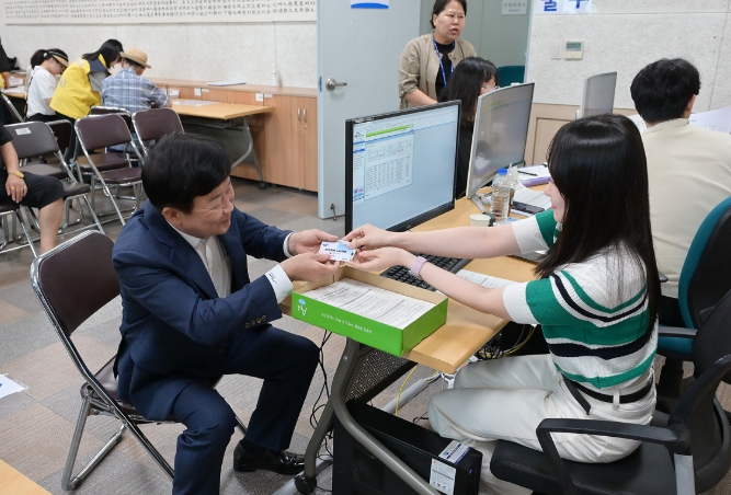 [무한뉴스=정민정 기자] 정기명 여수시장이 민생회복 소비쿠폰 1차 접수 이튿날인 지난 22일 쌍봉동주민센터를 방문해 발급 현황을 점검하고 직원들을 격려했다.