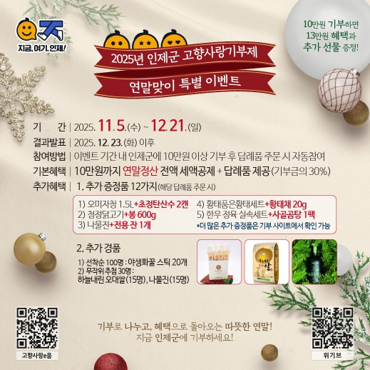 [무한뉴스=정민정 기자] 인제군이 연말을 맞이하여 고향사랑기부제 특별 이벤트를 오는 12월 21일까지 진행한다.