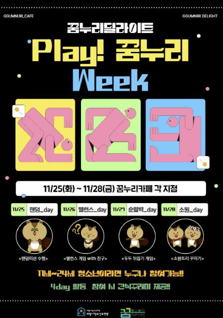 [무한뉴스=손성기 기자] 의왕시청소년재단 산하 의왕시청소년수련관 꿈누리카페(▲고천점( 문화공원로 33), ▲내손점(복지로 109), ▲오전점(찬우물길 11), ▲백운밸리점(백운중앙로 74, 총 4개 지점))는 오는 11월 25일부터 28일까지 4일간 꿈누리딜라이트 『Play! 꿈누리 Week』를 진행한다고 밝혔다.