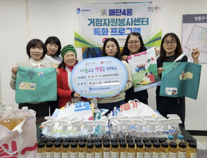 [무한뉴스=양현명 기자] 수원시 매탄4동 자원봉사캠프 코치와 봉사회원들은 지난 12월 19일, 지역 상권 활성화와 마을 공동체 활성화를 위해 회원들이 직접 만든 장바구니와 EM(유용 미생물)을 매탄4동 행정복지센터에 전달했다.