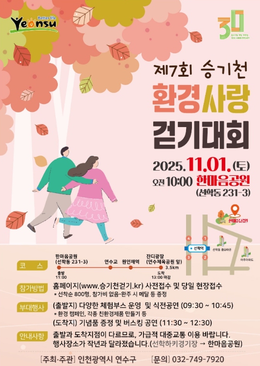 [무한뉴스=정승훈 기자] 연수구는 오는 11월 1일 오전 10시 한마음공원(선학동 231-3) 및 승기천 일원에서 구민과 함께 자연 속에서 걷는 ‘제7회 승기천 환경사랑 걷기대회’를 개최한다.