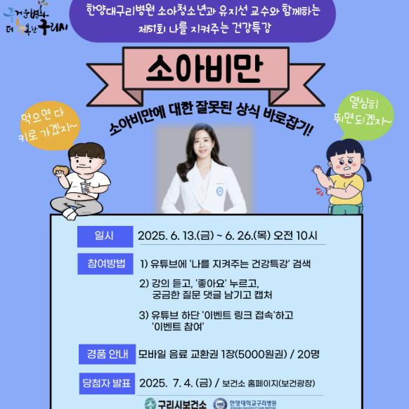 [무한뉴스=정승훈 기자] 구리시는 오는 13일 ‘소아비만’을 주제로 한양대학교구리병원 소아청소년과 유지선 교수와 함께하는 나를 지켜주는 건강특강을 구리시 공식 유튜브 채널(구리비전)을 통해 송출한다고 밝혔다.