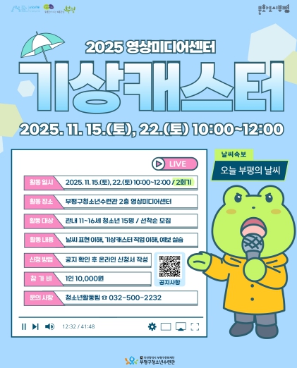 | ▲ 부평구청소년수련관, 영상미디어센터 11월 특강 ‘기상캐스터 직업 특강’ 참가자 모집 |