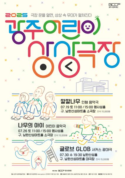 (재)광주시문화재단 관계자는 “광주 어린이 상상극장은 어린이들이 공연을 더욱 가깝고 자연스럽게 접할 수 있도록 기획된 프로그램”이라며 “가족이 함께 공연장을 찾고, 예술을 즐기는 경험이 일상 속 문화 향유로 이어지길 기대한다.”라고 전했다.