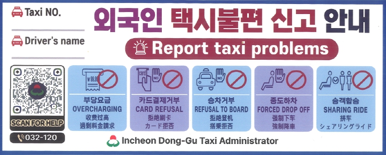 [무한뉴스=정승훈 기자] 인천 동구는 외국인 관광객을 대상으로 한 불법 택시 영업을 근절하고 이용 편의를 높이기 위해‘불편 신고 QR스티커’를 택시에 부착한다고 밝혔다.