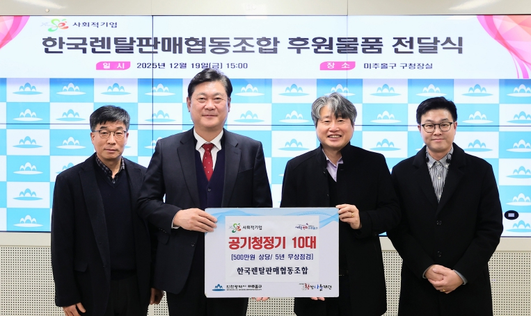 [무한뉴스=정승훈 기자] 인천 미추홀구는 지난 19일 사회적기업 한국렌탈판매협동조합(대표 정영이)으로부터 공기청정기 10대를 전달받았다.