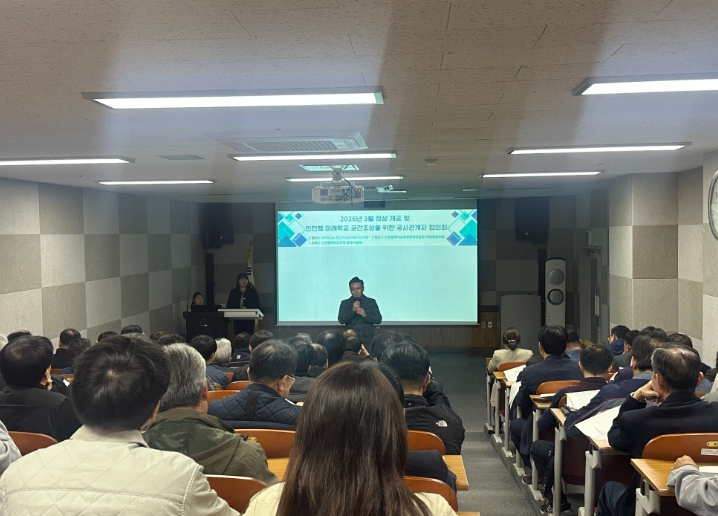 [무한뉴스=정승훈 기자] 인천광역시교육청은 12일 학교 건설공사 참여자의 자발적 공정관리를 유도하고 학교시설공사 품질을 확보하기 위해 신설학교 공사관계자를 대상으로 합동협의회를 개최했다.