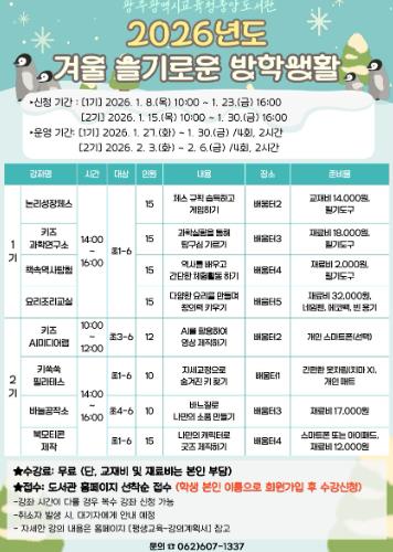 광주중앙도서관 김정희 관장은 “겨울방학을 맞이한 초등학생들이 도서관에서 준비한 다채로운 프로그램에 참여해 유익한 시간을 보내길 바란다”고 말했다.