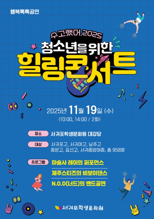 [무한뉴스=정승훈 기자] 제주도교육청 서귀포학생문화원은 19일 서귀포학생문화원 대강당에서 행복톡톡 공연 ‘수고했어 2025, 청소년을 위한 힐링콘서트’를 오전 10시와 오후 2시 두 차례에 걸쳐 개최한다.